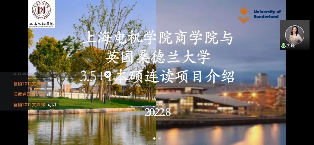 为进一步推动学院国际化发展,拓宽学生国际化视野,更好地指导应届毕业生实现高质量就业,8月16日晚,金年会 商学院与英国桑德兰大学“3.5+1”本硕连读项目宣讲会于腾讯会议平台成功举办。商学院党委副书记、副院长沈瑾,英国桑德兰大学华东联合办公室项目经理金晨星以及商学院毕业班辅导员代表、学生代表等50余人参加了宣讲活动。