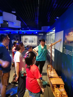 志愿者们9点准时到达中国航海博物馆,在志愿者休息室稍作休息,于上午九点半左右,讲解员工作正式开始。志愿者们每隔半小时左右轮流上岗,为前来观展的游客们带去优质的解说服务。讲解员们根据之前的培训内容合理设计路线,用富有吸引力的语言带领游客参观整个主题展览,并在相应展物前熟练地为各位游客做深入讲解,帮助游客更好地从沉船和贸易瓷器两条主线了解海上丝绸之路的历史以及展出的各类珍贵文物。解说志愿者们在共进工作餐后稍作休息,有相继投入紧张的工作。由于海丝大展的展览时间横穿暑期,因此本次大展也吸引了不少中小学生前来汲取知识,更是有外国友人慕名而来特意参观本次海丝大展。讲解员为驻足在展物前、充满好奇的小朋友们细心讲解,也为前来观展的外国友人耐心地解答问题,力求为游客们带去最好的观展体验。在志愿者们的共同努力下,活动得到了航海博物馆方的认可与赞扬,讲解活动于下午三点结束。